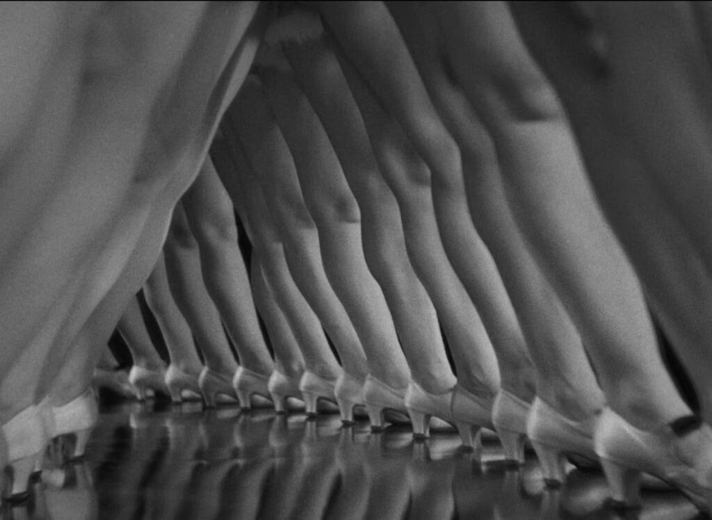 This closing segment, the Busby Berkeley material, is more than a wondrously produced sequence of three great songs. It’s a declaration of independence from the stage. The camera starts doing things that the stage’s flat proscenium would never allow: swooping, soaring, reorienting space so that bodies become geometry and choreography becomes architecture. The sets shift and unfold like mechanical magic tricks as space contracts and expands with each cut. In the movie’s most famous image, a chorus line becomes a moving corridor of sexual thrill and sensory possibility, the camera sliding under a forest of V-shaped legs. The shot is both an achievement both mechanical precision and artistic beauty, and isn’t that the history of cinema’s development in a nutshell?