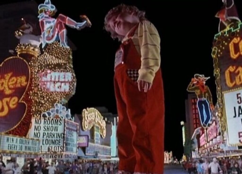 Three years after their previous size-shifting adventure, Wayne Szalinski (Rick Moranis) is now tinkering at a corporate lab while Diane (Marcia Strassman) holds the fort. A not-quite-explained growth beam zaps their toddler before long. At first nothing happens, but grows a little whenever the baby encounters electricity (or, given that electricity is literally everywhere in the modern world, whenever the story needs the baby to grow). Soon the kid is door-frame tall, then neighborhood tall, and inevitably skyscraper tall. Meanwhile, the now-teenaged Nick (Robert Oliveri) develops a bashful crush on babysitter Mandy (Keri Russell). The movie’s middle stretch is the film’s sweet spot, the promise of the premise: Wayne and Nick scrambling to corral a seven-foot wobble-monster around the house, the floorboards rumbling to “The Locomotion” as the baby bounces in rhythm.
