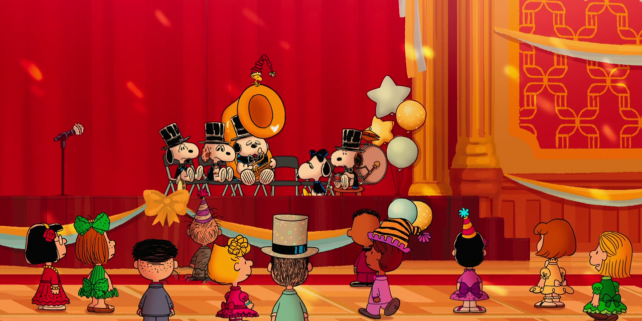 We also get a strong sense of the new series of specials’ animation style in For Auld Lang Syne. It’s a tribute to the familiar Melendez designs and colors, but with a 2020s sheen. Lines are still thick and cartoonish, and characters still move sorta like cels, but the look has a digital snap. The simple but expressive style of Melendez’s animation that was so effective in bringing comics to life has been enhanced with some clearly digital touches: for example, shimmering animated effects or a roving virtual camera, especially when the whole gang fills an old theater. You can feel the team turning knobs and testing themselves — how glossy can they go before the newsprint soul flakes off? Sometimes the modern bells and whistles ding a little too loud, and the movie’s slickness overpowers its faux-Melendez simulated humility. But the visual sensibility is, overall, right to my eyes: gentle and engaging character animation on simple and colorful backgrounds.