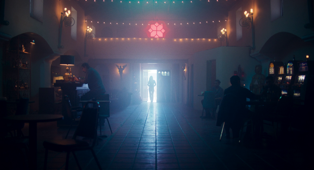 The weird, off-kilter tempo of the dialogue and the editing is underscored by the sound design. During the scene transcribed above, for example, there’s a country ballad playing in the background of the dimly lit bar, and in every yawning gap between lines, you notice it. This sort of auditory ambience is present in any given scene; if it’s not diegetic music, then it’s the sound of traffic, or the wildlife of the Mojave desert, or the rantings of a radio shock-jock. Persistent reminders of a larger universe, out of focus, churning on, indifferent to whatever’s happening here in NWR’s minutely controlled dioramas.